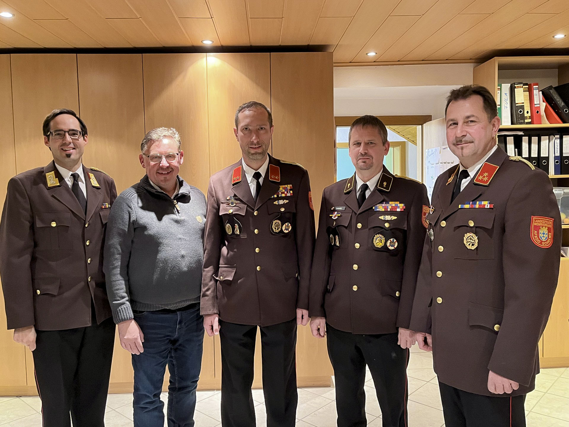 Foto: Das Kommando in Niederschrems wurde wiedergewählt und darf sich auf weitere fünf Jahre im Dienst freuen. Bürgermeister Ing. Mag. David Süß (li.) und Vizebürgermeister Franz Pichler (2.v.li.) gratulieren herzlich zur Wiederwahl.
